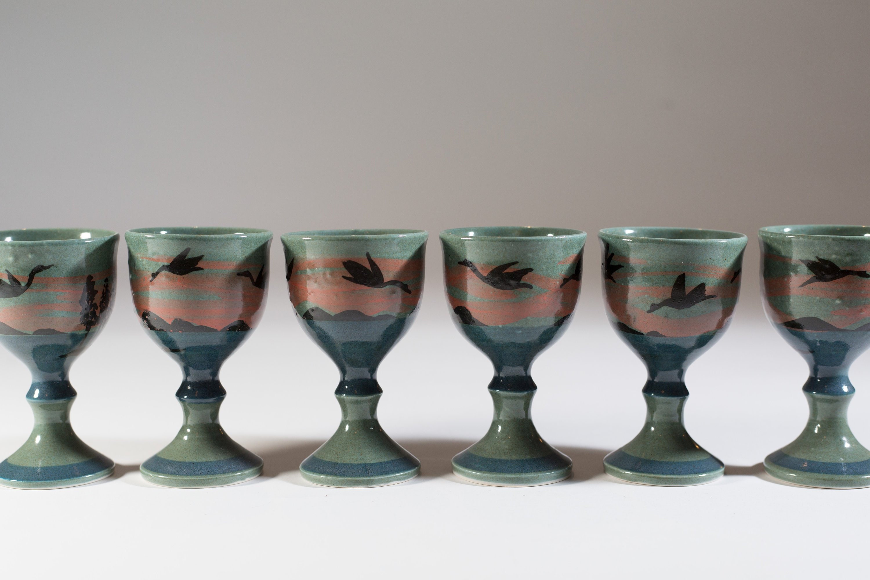 6 Ceramic Wine Goblets Handmade Green And Blue Earthy Vintage Wine Glasses With Flying Ducks Geese Birds Canadian Studio Pottery